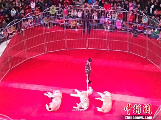 中新网库尔勒12月21日电 (杨厚伟)20日,在新疆库尔勒一商场内,老虎、狮子等动物在训兽员的指引下,做着高难度表演。商场所有楼层被观看的观众围得水泄不通。