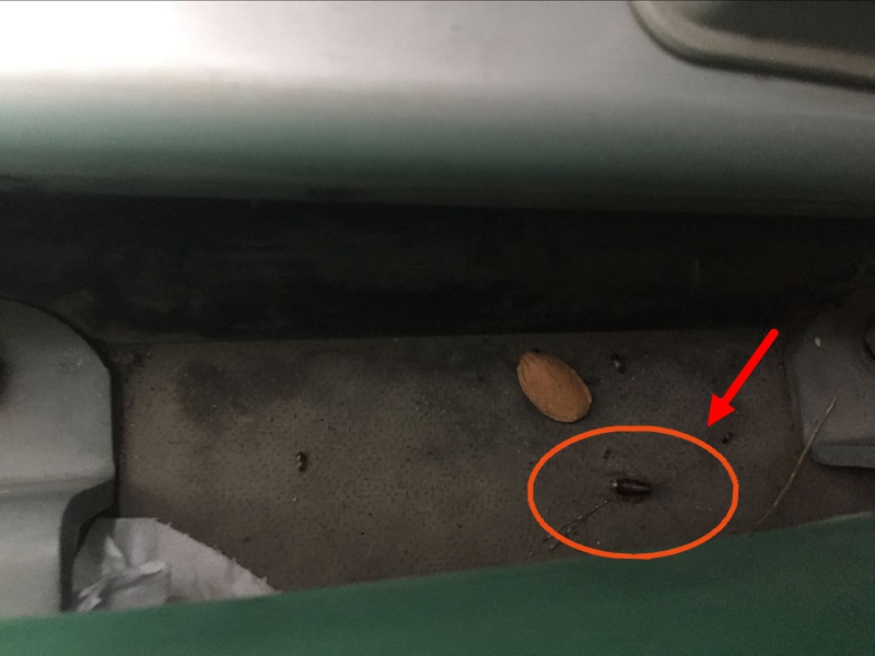 没过多久,他突然发现前面女乘客的衣服上竟然又有一只蟑螂在爬,他帮女乘客将蟑螂弹到了地上。女乘客看到蟑螂,吓了一跳。后来,李先生又在座位旁的缝隙看到,两只蟑螂在一颗话梅核旁爬动。