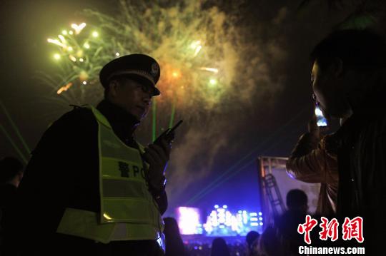 珠海市公安局3日对外公布,该市元旦期间共投入安保警力1.1万余人次,加强对全市42个重点部位场所的巡逻防控,图为民警在“全城倒数拥抱2016”跨年音乐焰火派对现场执勤 张浩 摄