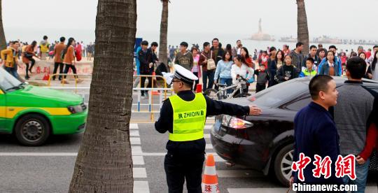 珠海市公安局3日对外公布,该市元旦期间共投入安保警力1.1万余人次,加强对全市42个重点部位场所的巡逻防控,图为交警在情侣路段执勤 冯坚 摄