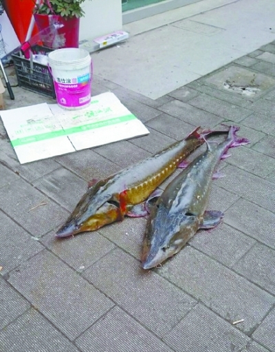 本报讯(记者张全录) 昨天中午,市民汪先生发现,将军一路农业银行旁的一家渔具店门前摆着两条鱼正在售卖,疑似中华鲟。他立即给本报反映:这是国家一级重点保护野生动物,堪比国宝,怎能当街叫卖。