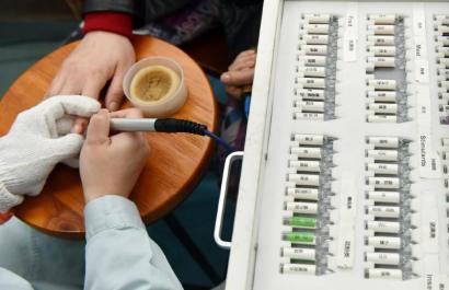 为黄女士筛查过敏原的正是这台生物共振仪,它由主机、试剂盒、感应垫、检测笔及柱状电极等组成。卢亮用检测笔轻触黄女士的指尖,另一头的感应垫则在试剂盒中进行扫描,每接触一下,都发出“滴滴”的声音,主机的表盘上同时会显示一个数值。“当数值大于30时,证明测试者缺乏试剂盒中该物质的抗体。”卢亮说,换句话说,在感应垫扫描到的10多种试剂中,测试者至少其中一种物质有过敏反应。然后,再对这10种试剂进行筛查,整个过程只需要10多分钟。