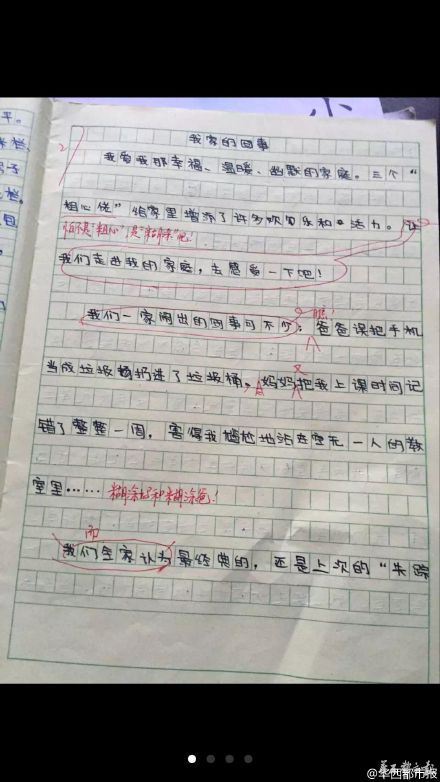 【小学生爆笑作文:爸妈撸完串忘接我 我还是不是亲儿子?】近日,成都龙江路小学的詹夏瑞同学,写了篇爆笑作文:一家人旅游时停车吃烤串,爸妈吃完就走完全忘了他!他当即吓哭,烤串老板帮忙联系爸妈后,“我愤愤地质问,我还是不是亲生儿子!”