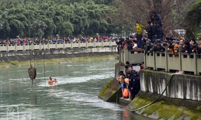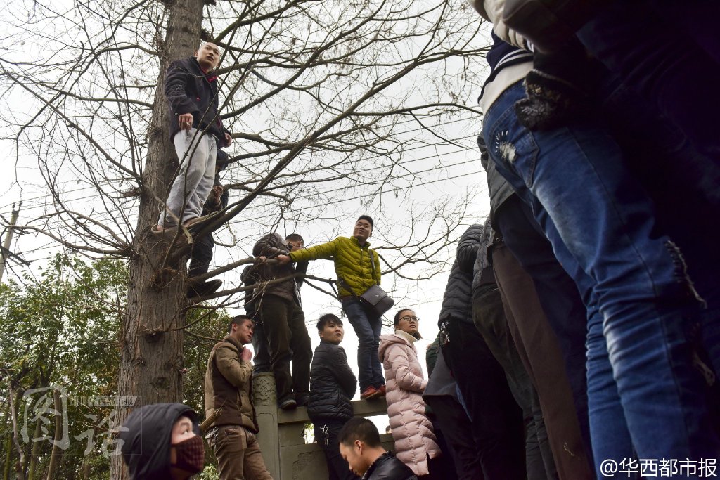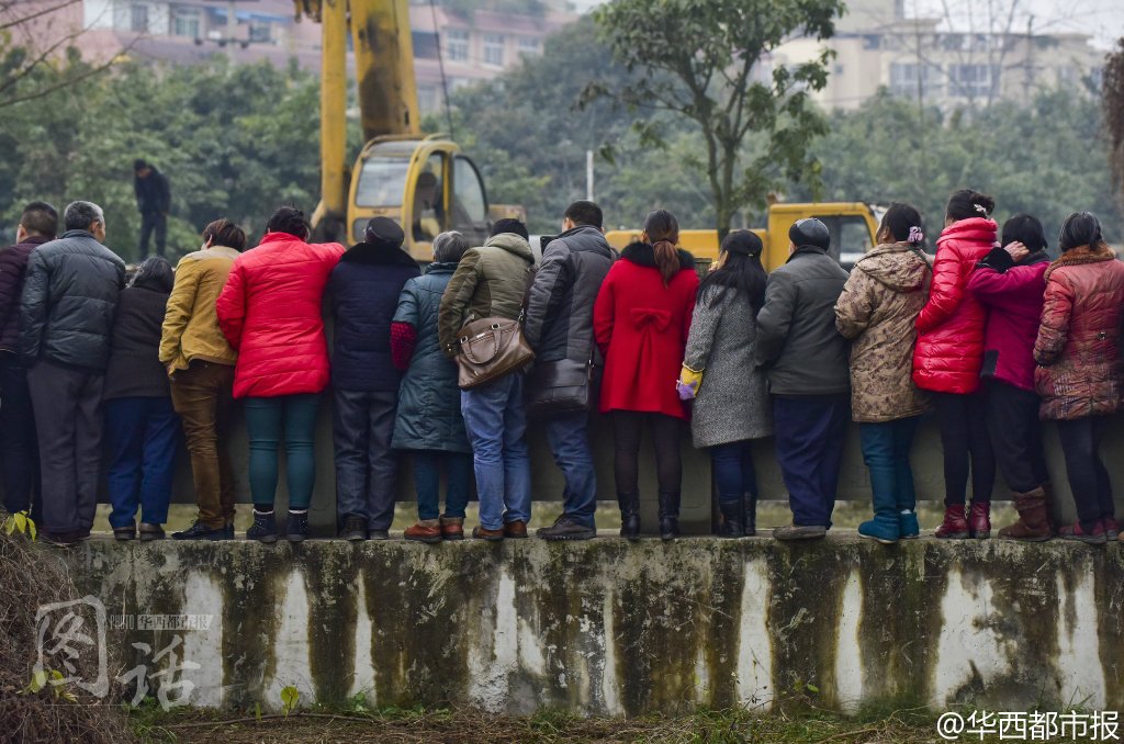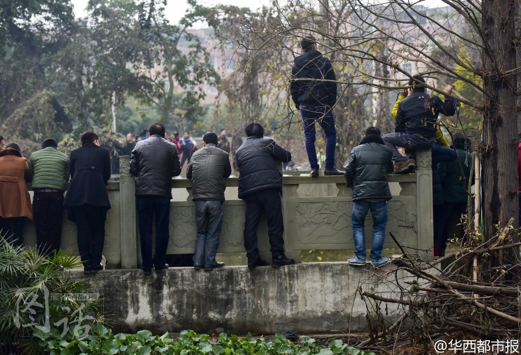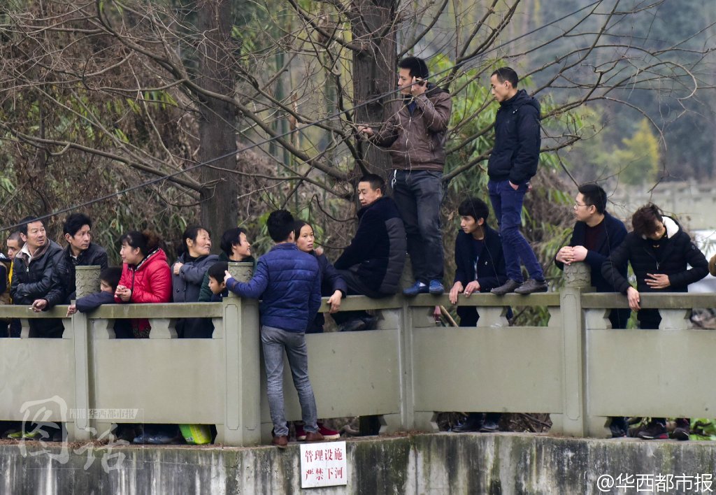 @华西都市报:【如此围观?】11日,成都一出租车落入河中,冬泳爱好者零度帮忙打捞,下午6时许,出租车被打捞上来,车内无人。而在打捞现场,上百市民围观,有人站在栏杆上,还有人爬上了树……而在河边的半亩豌豆尖也遭到了踩踏。围观有风险,看热闹也要谨慎!#成都出租车落河#记者吕甲
