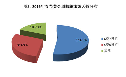 春节邮轮旅游出游天数方面,6晚7日游占52.61%,5晚6日游占28.69%,整体7日以内的线路占比超80%。