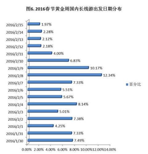 国内长线游出发时间相对集中在大年初一和初二,66%选择错峰出游