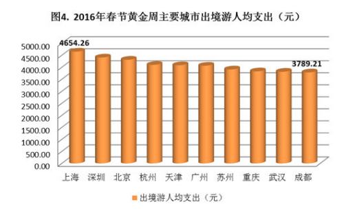 以实际预订数据统计,2016年春节出境游在线预订的人均支出为4186.62元(仅包含旅游线路、酒店、交通票务等开支,不含目的地购物等其他支出),与往年相比略有上升。《报告》认为,人均花费的增长主要原因在于高品质出境游产品需求的增长。出境游人均支出最高的是上海,人均支出为4654.26元,另外深圳、北京、杭州、天津、广州、苏州、重庆、武汉、成都等出境游主要客源地的人均支出也在4000元上下,具体见图4。