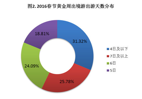 出游天数方面,从实际预订情况看,2016春节黄金周期间出境游的出游天数主要集中在5日游和6日游,合并占比42.9%,出游天数7日及以上的占比25.78%,4日及以下的占比31.32%。