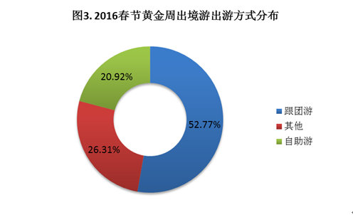 出游方式方面,春节黄金周期间国内长线游自助游的比例为35.46%,跟团游和半自助游的比例为64.54%。