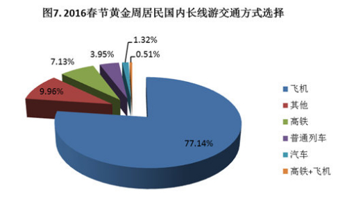 根据同程旅游平台的实际预订数据,《报告》还提供了春节黄金周期间居民国内长线游对交通工具的选择情况。数据显示,往返均选择飞机为交通工具的(即双飞)占77.14%,往返均选择高铁(包含动车组列车)的占7.13%,也有极少数游客选择了高铁+飞机的往返组合,另有部分游客选择了自驾等交通方式。