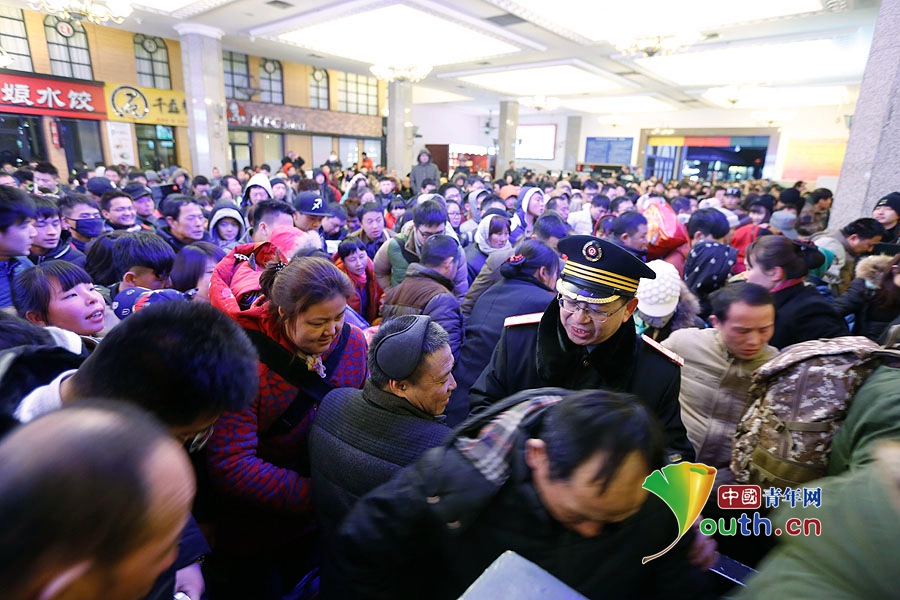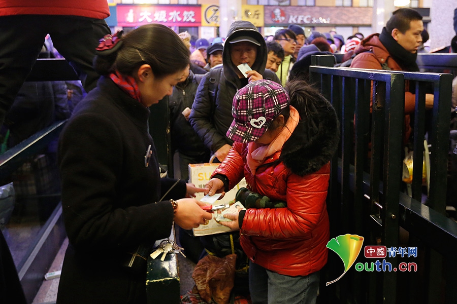 车站工作人员耐心为乘客检票。中国青年网记者 张炎良 摄
