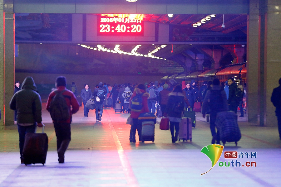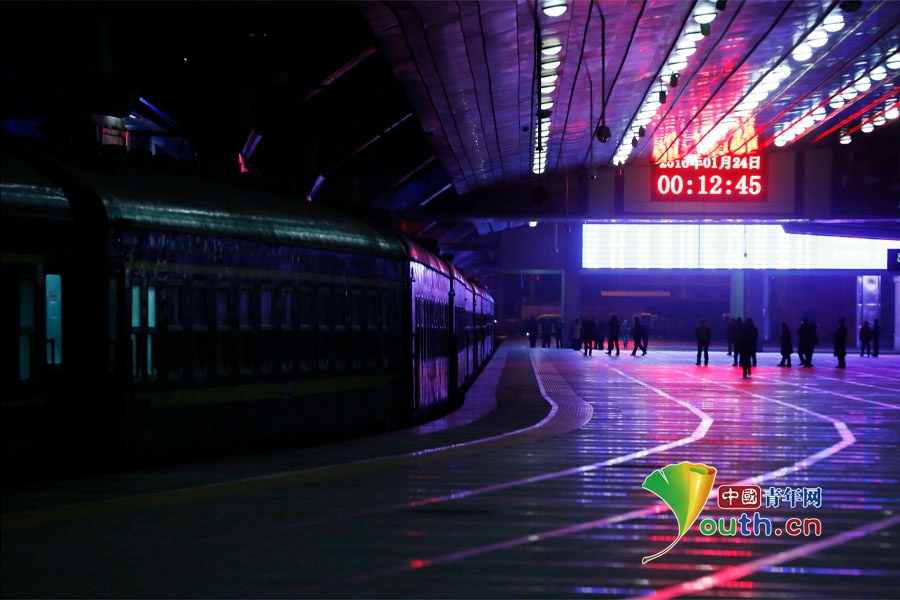 1月24日0点11分、3603次列车从北京站发出开往重庆,这是是2016年春运北京铁路局开出的首趟列车。中国青年网记者 张炎良 摄