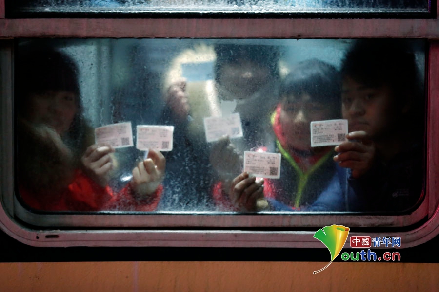 1月24日,北京遭遇极寒天气,夜间气温低至零下15度。几位旅客隔着被冰冻上了的玻璃窗向记者展示北京至重庆的3603次列车车票,全程票价109元。中国青年网记者 张炎良 摄