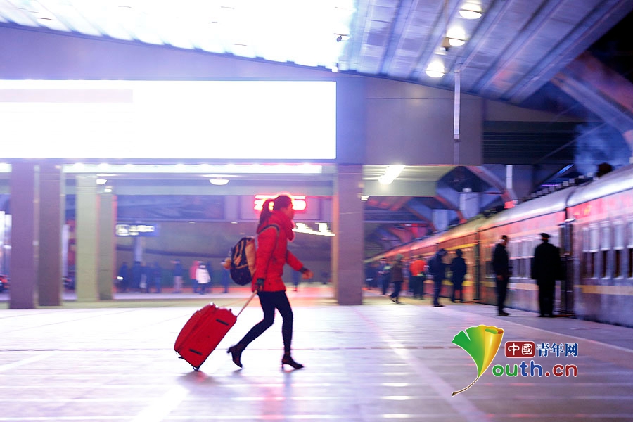 寒夜,一位女青年踏上返乡的旅程。中国青年网记者 张炎良 摄