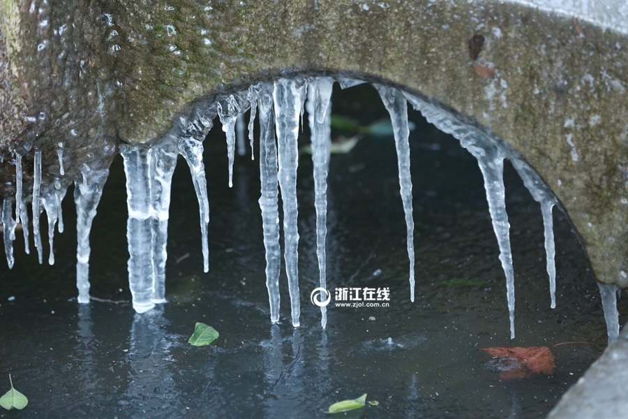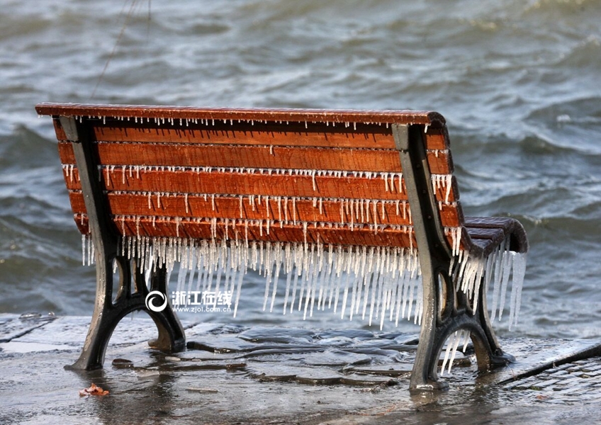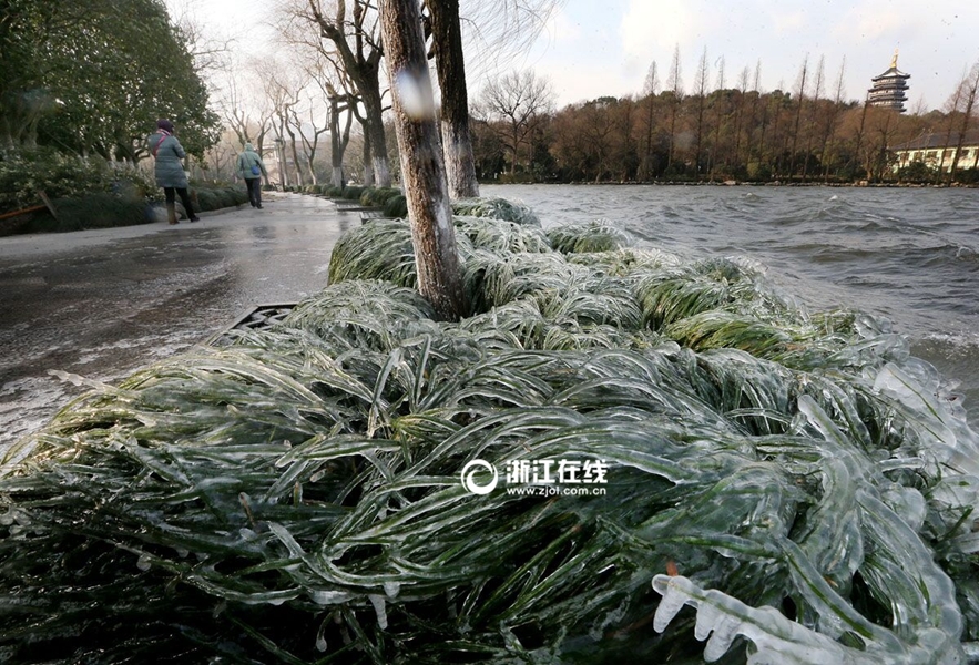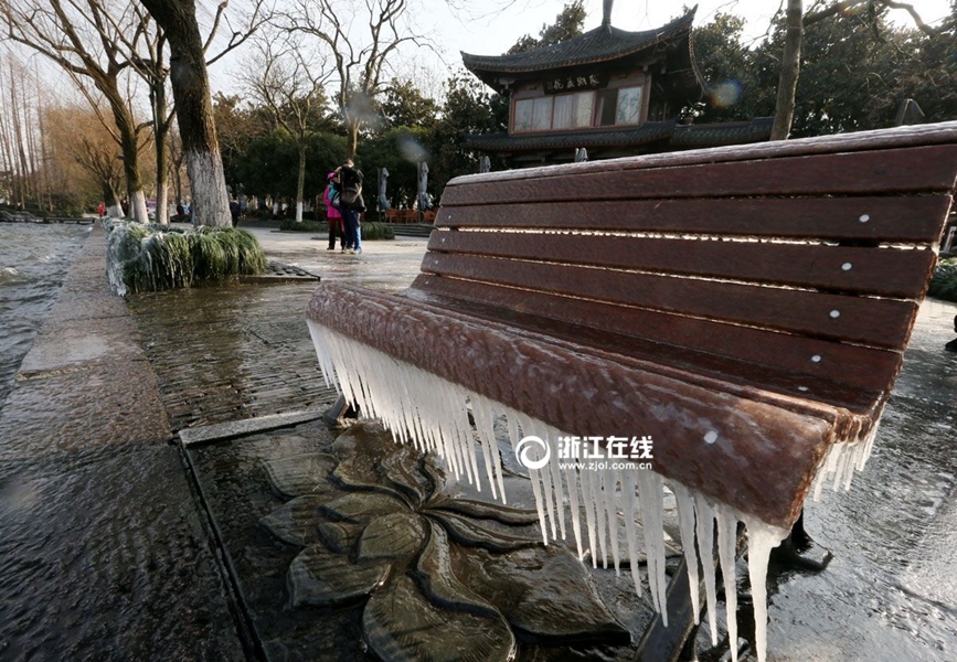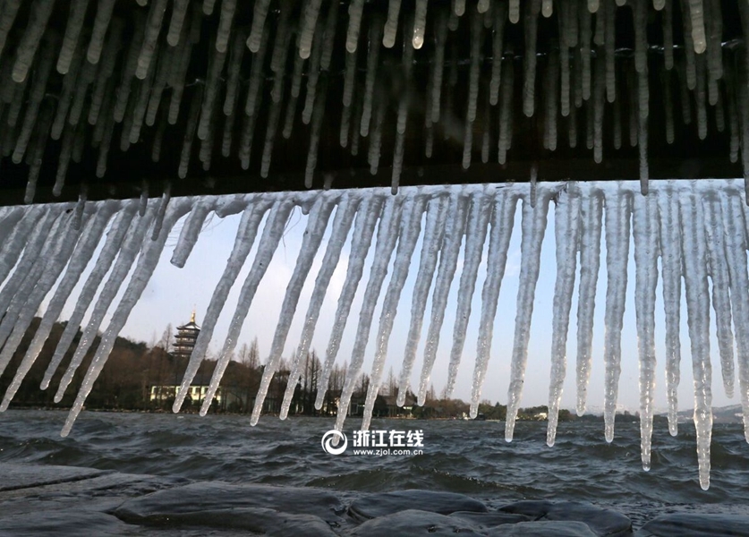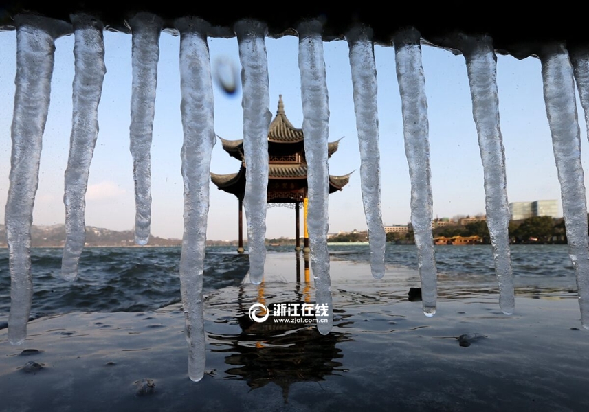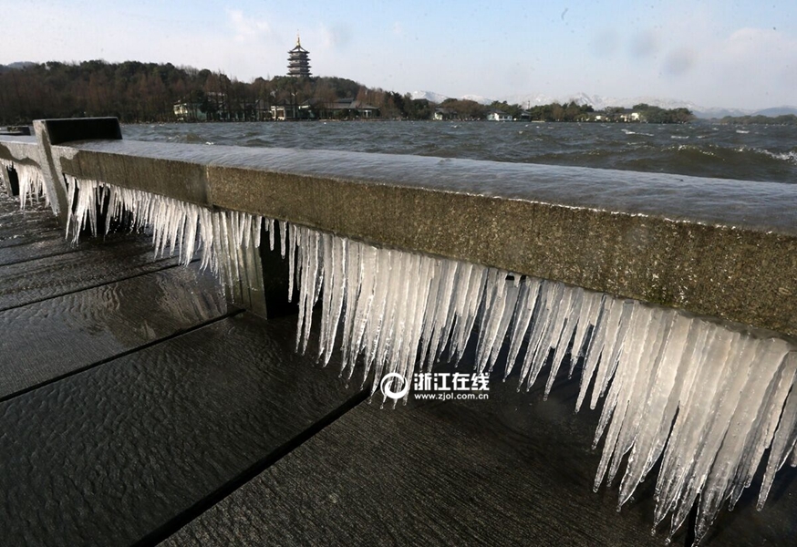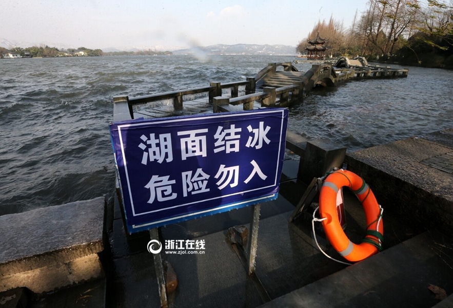 西湖孤山附近水域大面积“沦陷”,出现了明显的冰冻。