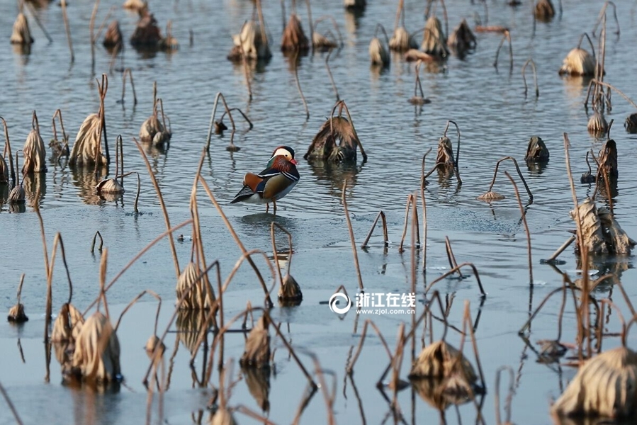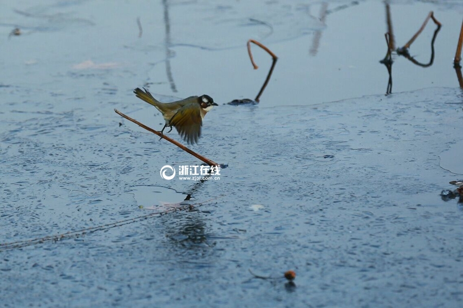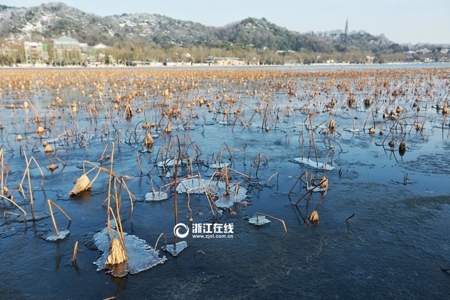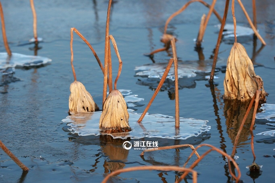 杭州市气象台于1月24日发布寒潮橙色预警信号,预计25日早晨城区最低气温零下9度左右。西湖孤山附近水域大面积“沦陷”,出现了明显的冰冻,冰层不厚,但可以承受小鸟和野鸭在上行走。随着水面的上下波动,枯荷带着悬冰跃然水上,美呆了。