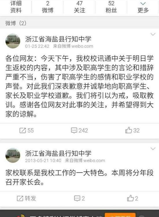 据了解,该中学已于1月25日晚在其官方微博上发表道歉信息:“我校校讯通中关于明日学生返校的内容,其中涉及职高学生的言论和措辞严重不当, 伤害了职高学生的感情和职业学校的声誉。对此我们深表歉意并诚挚地向职高学生、家长及职业学校道歉。我们将引以为戒,吸取教训。感谢各位网友对此事的关 注,并希望得到大家的谅解。”(实习生 蒋欣)