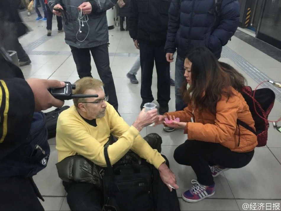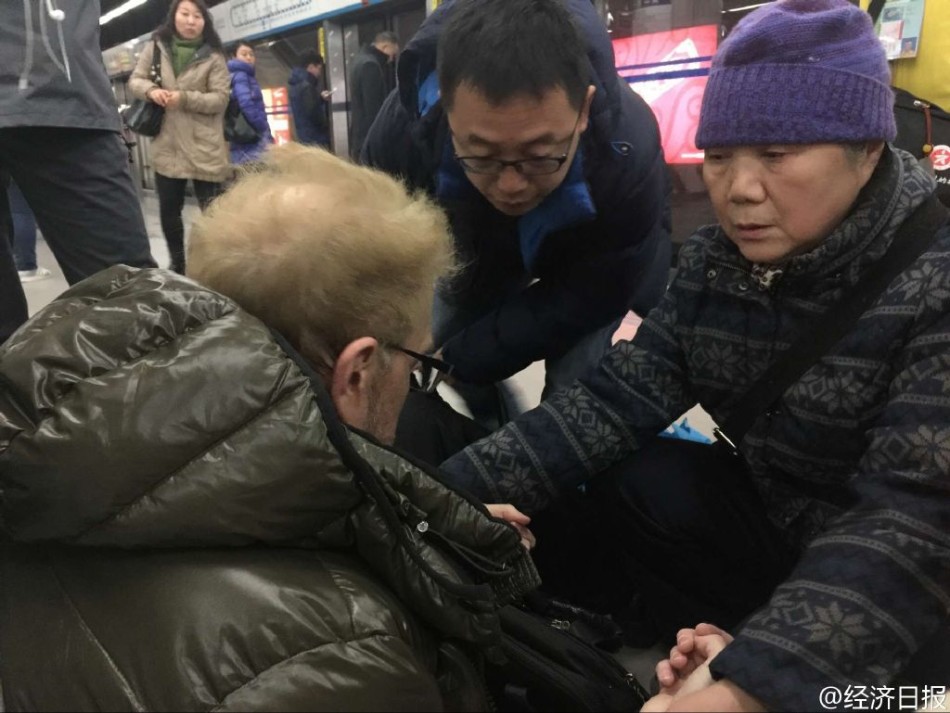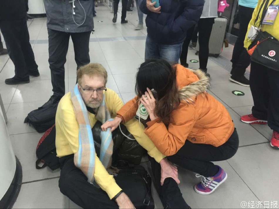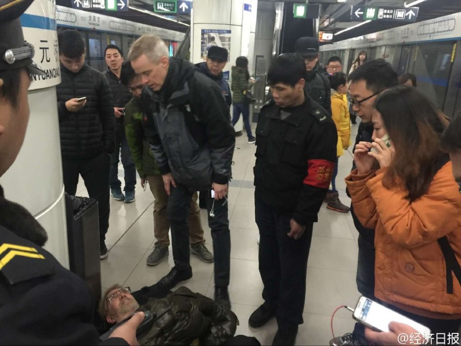 2016年1月28日,北京,一外国男子在太阳宫地铁站内晕倒,路人立刻过来搀扶。一女孩立刻拨打急救电话;一男孩脱下羽绒服为他披上;懂中医的阿姨为他按摩穴位;急救人员5分钟内赶到诊治。事后,晕倒的外国男子称:“我感觉好多了,谢谢!”。