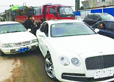 昨天上午11点左右,在洪山区白沙洲大道武汉工商学院门前,一辆白色大众桑塔纳撞上了一辆白色宾利的右后车门。宾利车主称不要对方赔,自己承担28万元车损。