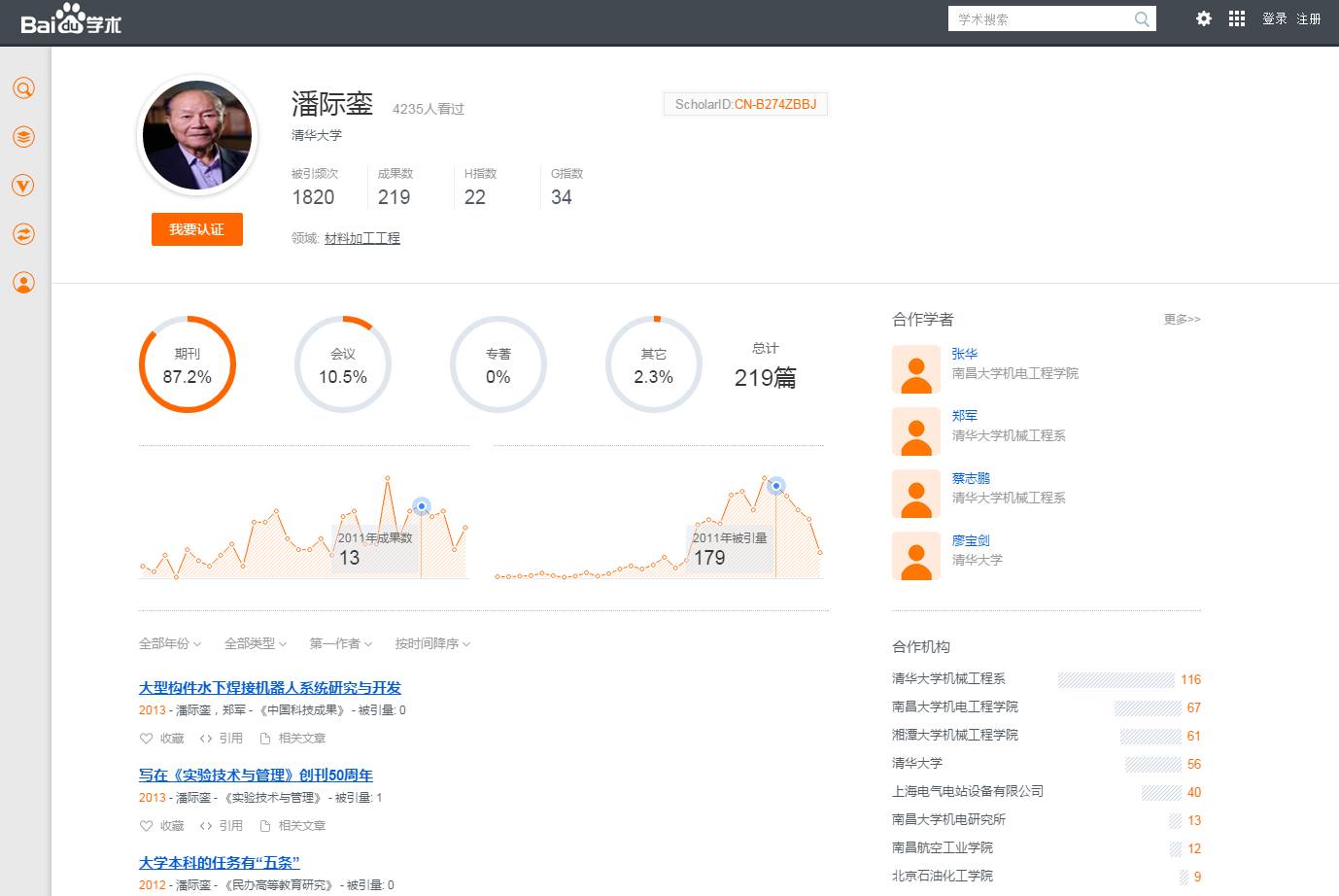 潘际銮院士在百度学术的学者主页上的学术成果相比于很多学者并不算多,以第一作者发表的文章仅四十多篇。