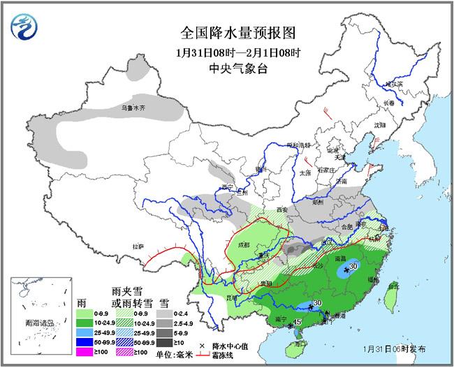 1月31日08时至2月1日08时,新疆北部和西南部、青海东部、陕西南部、甘肃南部、黄淮南部和西部、江淮、江汉、江南北部、贵州中北部等地有小到中雪或雨夹雪,局部有大雪;西南地区东部、云南东南部和北部、江南中南部、华南等地有小到中雨,其中,江西中部、广西南部沿海和东北部、广东西部等地的部分地区有大雨。台湾海峡将有7~8级、阵风9~10级的大风。