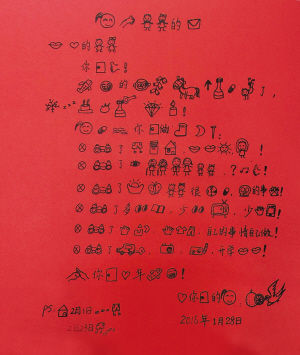 “这又是图画,又是数字,又是字母的,难道是传说中的火星文。”彤彤妈妈将背面的翻译文打开,这才看懂了意思。随后,她将这封奇特的信发到了自己的微信朋友圈,引来了好友们的关注和议论。