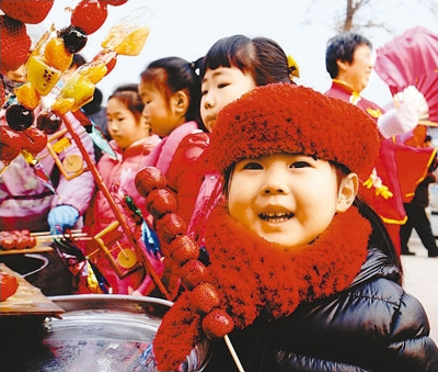 2月9日,北京大兴区庞各庄镇梨花村年货大集上吃糖葫芦的小朋友。