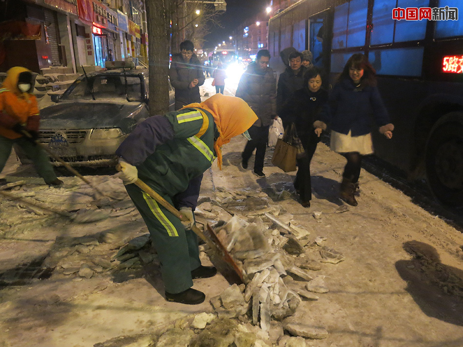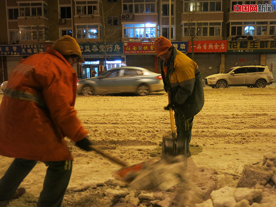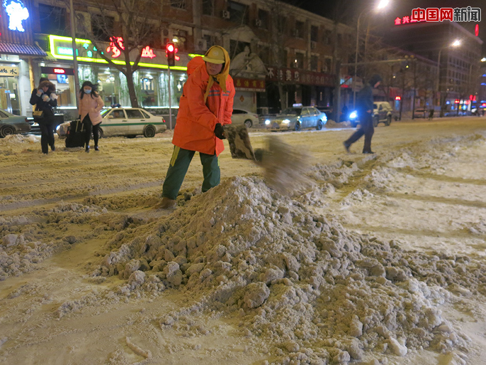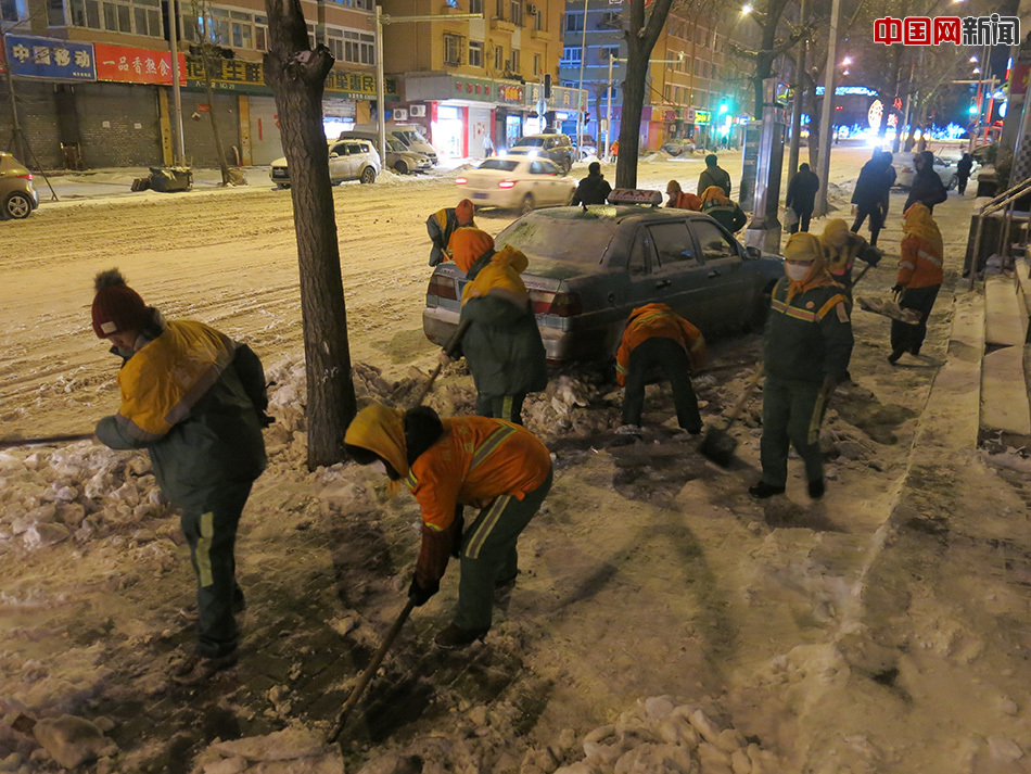 中国网大连2月14日讯(记者 魏婧)2月13日,猴年大年初六,辽宁省大连市遭遇暴雪。19时左右,记者来到位于大连市西岗区的八一路附近,看到在-5℃的气温中,十多位环卫工人顶着大风在马路上用铁锨清理厚厚的积雪。