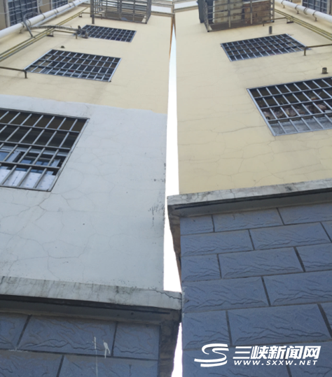 最明显的是,3单元与4单元间的顶部已紧紧的“靠在了一起”,3单元中部的一处屋檐已出现裂纹,紧紧地贴在4单元的墙体上。