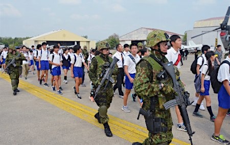 该演练假想某国发生大地震,导致治安极度恶化。日本人学校的初中生等80人扮演了需要撤离的角色。他们乘坐汽车从基地附近城市Sri Racha出发,在越野车的护送下抵达基地,接受手提行李检查后,登上航空自卫队C-130运输机起飞。