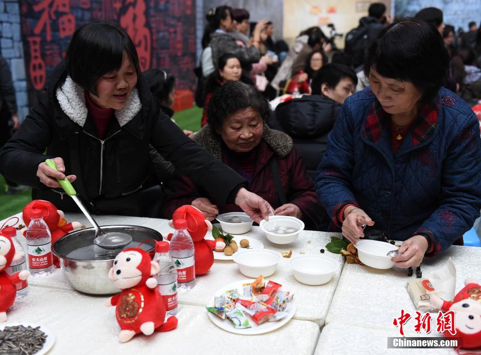 2月18日,重庆渝中区邀请300户拆迁居民600余人重新团聚一堂吃汤圆,庆祝即将到来的元宵佳节。据了解,重庆渝中区“十八梯”居民因拆迁搬离了老社区,为让老邻居再叙邻里情,重庆渝中区政府组织了此次吃汤圆庆元宵活动。图为老邻居欢聚一堂吃汤圆庆元宵。 周毅 摄