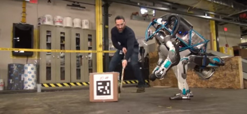 而最令人印象深刻的还是视频中,一个实验员用曲棍球球杆将Atlas手中的箱子击落并移开,机器人会自主地追赶目标物体。还有一个画面是实验员将Atlas推倒,但它却又站了起来。