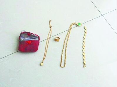 昨天上午11点46分,江夏金口派出所接女孩易天颖报警称:在自家居住的金水闸钓鱼咀69号门前墙壁缝里,发现一个暗红色的破布袋,打开一看,里面有3条金链子和一枚金戒指,想交给民警。