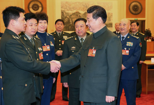 2014年3月11日,中共中央总书记、国家主席、中央军委主席习近平出席十二届全国人大二次会议解放军代表团全体会议并发表重要讲话。这是会议结束时,习近平来到部分基层和科研一线军队人大代表中间,同大家亲切交谈。新华社记者李刚摄