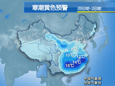 今天,冷空气将继续向南推进。中央气象台预计,8日至11日,中东部大部地区气温将明显下降,其中江淮西部、江汉南部、江南、华南北部、贵州等地的部分地区降温幅度可达12~16℃;本次寒潮过程日最高气温降幅最明显,其中江淮、江汉、江南、贵州等地日最高气温将下降15~20℃,10日上述地区日最高气温可降至4~8℃;江淮及其以南地区日最低气温出现时间为11日凌晨,江淮、江南大部最低气温将达到0~4℃。北方地区10日起、南方地区12日起气温将逐渐回升。