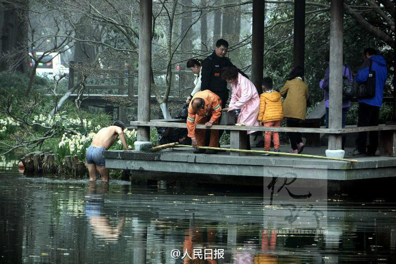3月6日上午,杭州太子湾公园一女游客拍照时不小心把手机掉进了湖里,正在不远处工作的绿化工老葛,二话不说,脱掉衣服就跳进冰冷的水里,为游客捞手机。汪建春摄