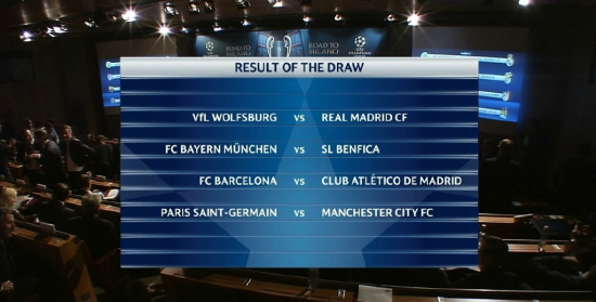 中新网3月18日电 北京时间今天傍晚,15-16赛季欧洲足球冠军联赛八强战的抽签仪式在欧足联总部尼翁进行,最终四组对决分别为:皇马VS沃尔夫斯堡、拜仁VS本菲卡、卫冕冠军巴萨VS马竞、两支土豪球队大巴黎与曼城正面对决。