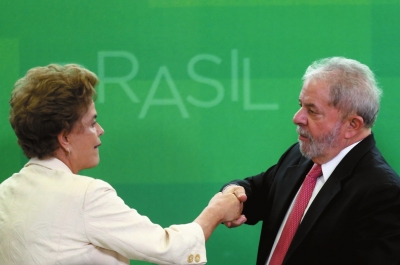 3月17日,总统罗塞夫(左)与卢拉在就职仪式上握手。新华社发