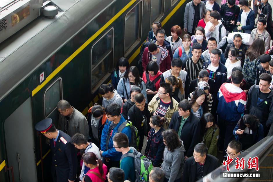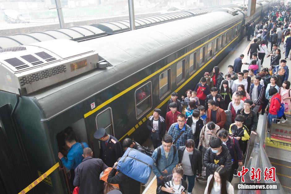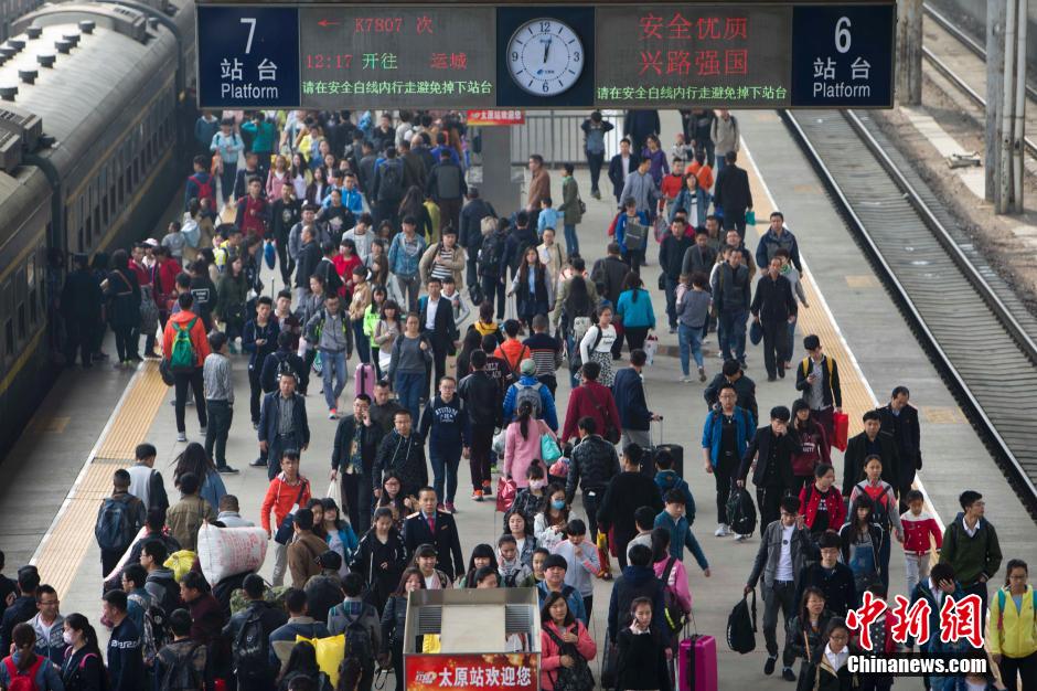 4月4日,山西太原火车站,乘车的民众让站台显得人满为患。当日,清明小长假最后一天,探亲、祭祖、旅游的民众纷纷踏上返程,中国多地铁路、公路、民航迎来客流返程小高峰。 张云 摄