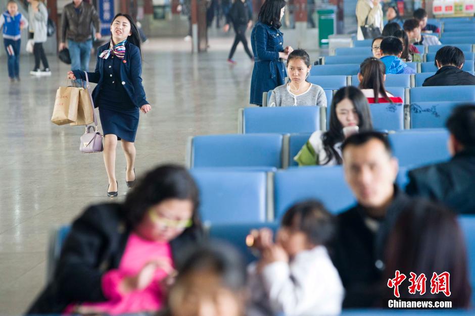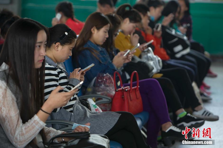 4月4日,山西太原火车站,等待乘车出行的民众在玩手机消磨时间。当日,清明小长假最后一天,探亲、祭祖、旅游的民众纷纷踏上返程,中国多地铁路、公路、民航迎来客流返程小高峰。 张云 摄