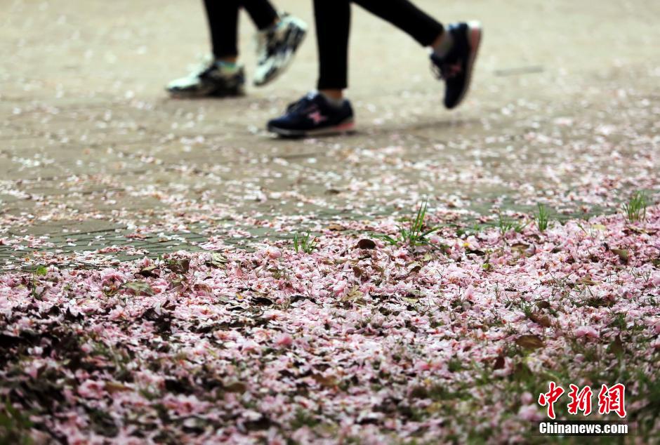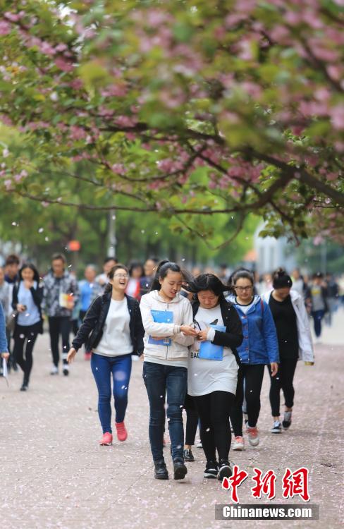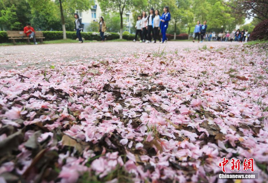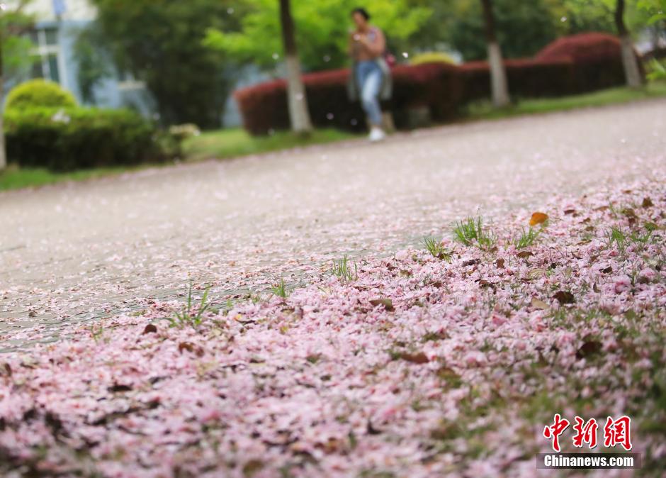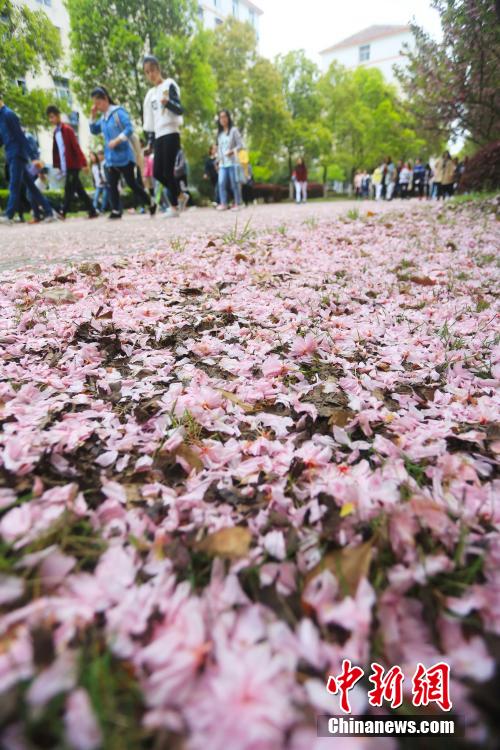 4月5日,位于江西九江的一大学校园内,道路两旁的樱花盛开,阵风刮过,便下起漫天的“粉色雨”,适逢下课,不少学生漫步徜徉其间。美景吸引过往学生乃至周边市民前来赏花拍照。 张驰 摄