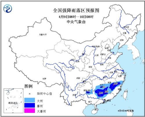预计,9日08时至10日08时,江南中南部、华南北部、贵州东南部等地有大雨,其中,浙江南部、福建西部、江西南部和东部、湖南南部、广东北部、广西东北部、贵州东南部等地的部分地区有暴雨,局地大暴雨(100~110毫米);上述部分地区有短时强降水,小时雨强20~50毫米,局地伴有雷暴大风或冰雹。中央气象台4月9日06时发布暴雨蓝色预警。