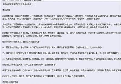 昨天,记者在网上找到了王星钢当年这篇帖子。在帖子中,王星钢还草拟了一个借款计划,其中两条是这样写的:“愿意借款的网友,金额不限,请留下实名与联系地址、电话,虽不敢承诺还款日期,但穷我一生之力,定当一一偿还……所有借款均作为家父治疗费用,用于检查、治疗、减轻病痛。所有用款均将列出明细公布。如最后有所节余,可征求各位借款人意见,予以退还,或建议以集体名义捐助其他贫困病患。”