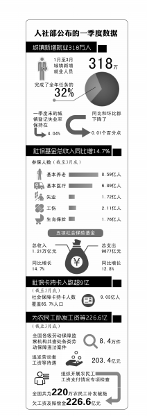 他还透露,今年一季度五项社会保险基金总收入为1.21万亿元,同比增长14.7%;总支出为9677亿元,同比增长12.8%。
