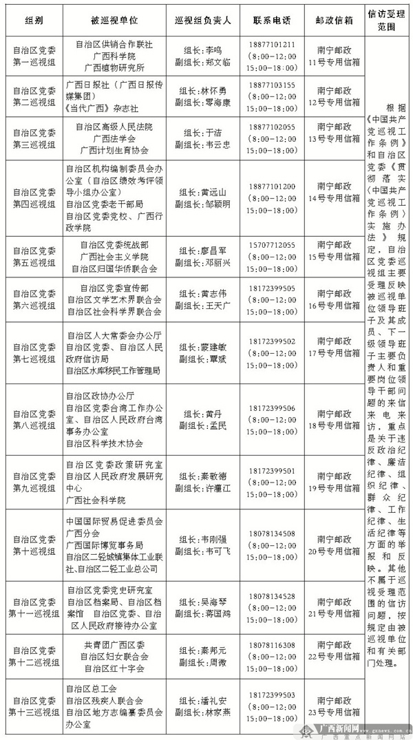 本轮巡视从5月初开始至6月底结束,将采取“一托三”方式对9个自治区党委部门、12个群团组织、16个事业单位和自治区高级人民法院开展专项巡视。自治区党委13个巡视组将于5月上旬进驻完毕。