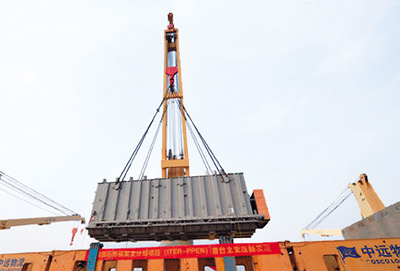 中国承担设计的脉冲高压变电站(PPEN)400KV高压智能主变压器正在被吊运。