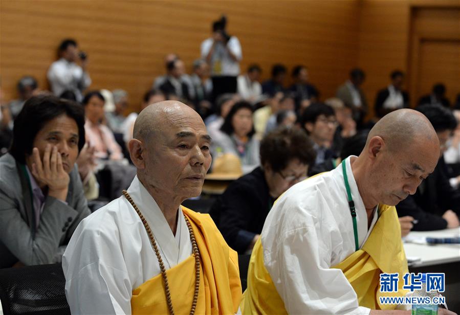 5月19日,在日本东京,两名僧侣出席集会。新华社记者马平摄