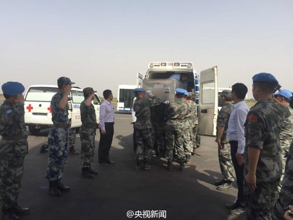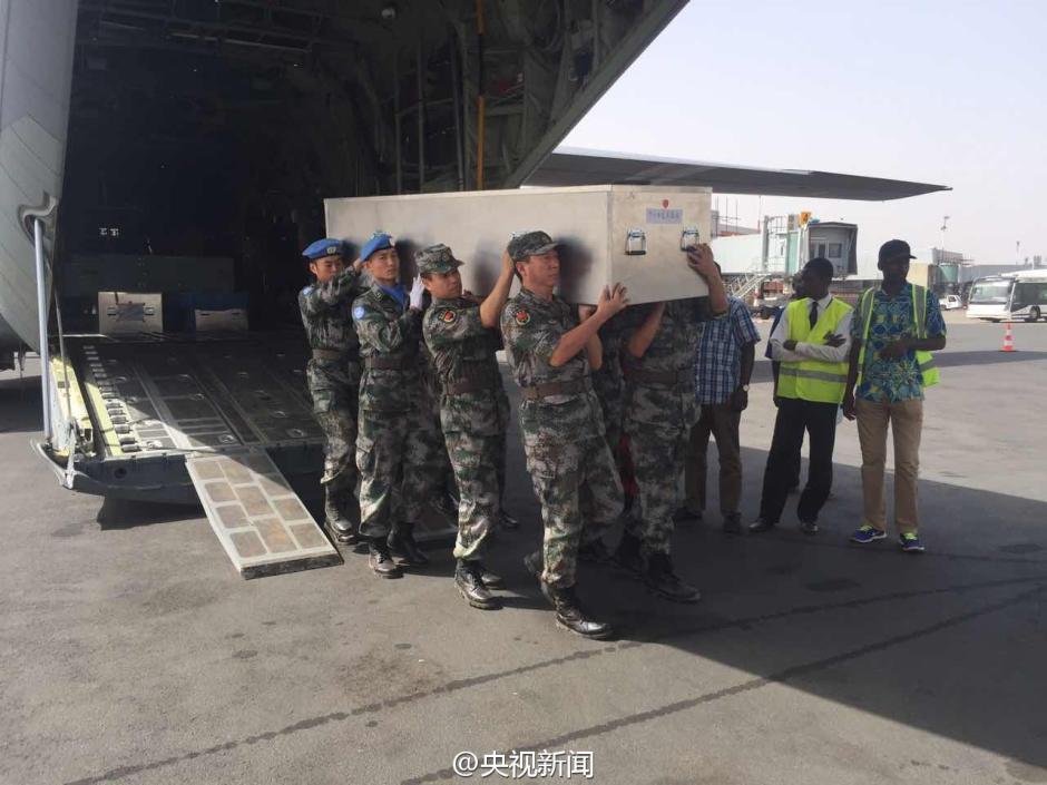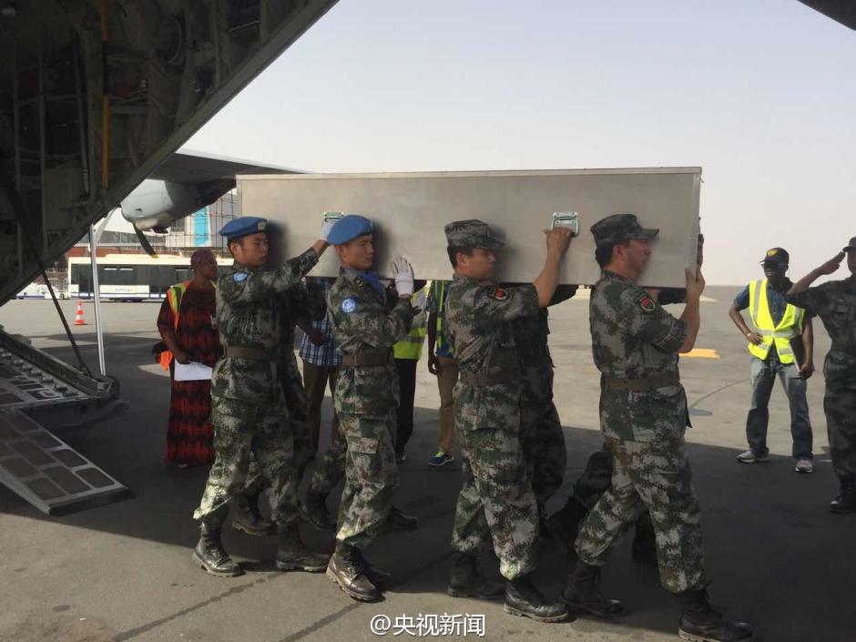 当地时间6月6日15:10,马里首都巴马科,搭载中国维和士兵申亮亮遗体灵柩的联合国专机,从加奥飞抵首都巴马科。中国驻马里维和部队4名士兵以及4名军方工作组成员为英雄扶灵。央视记者陈丽 图片来源:央视新闻微博