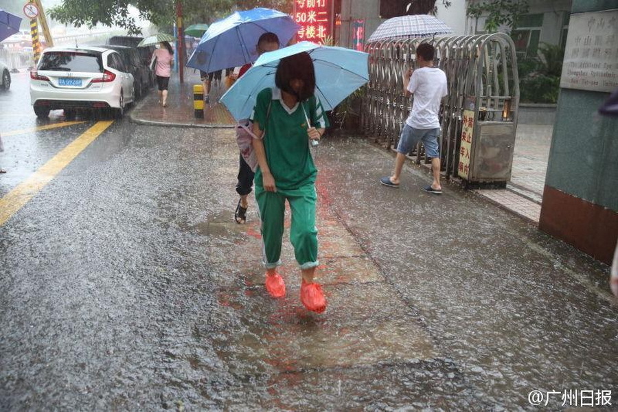 由于暴雨原因,有些学生提着运动鞋光脚走进学校。供图:广州日报官方微博