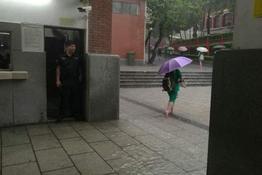 6月8日是高考第二天,今天凌晨,广州市区及其他各区出现了中到强雷雨。早晨,广州市区出现短时强降水,8时许,华附考点陆续有考生进场。由于暴雨原因,有些学生提着运动鞋光脚走进学校,也有家长为孩子学生准备好干净的鞋子,以备考生进教室后更换。供图:广州日报官方微博